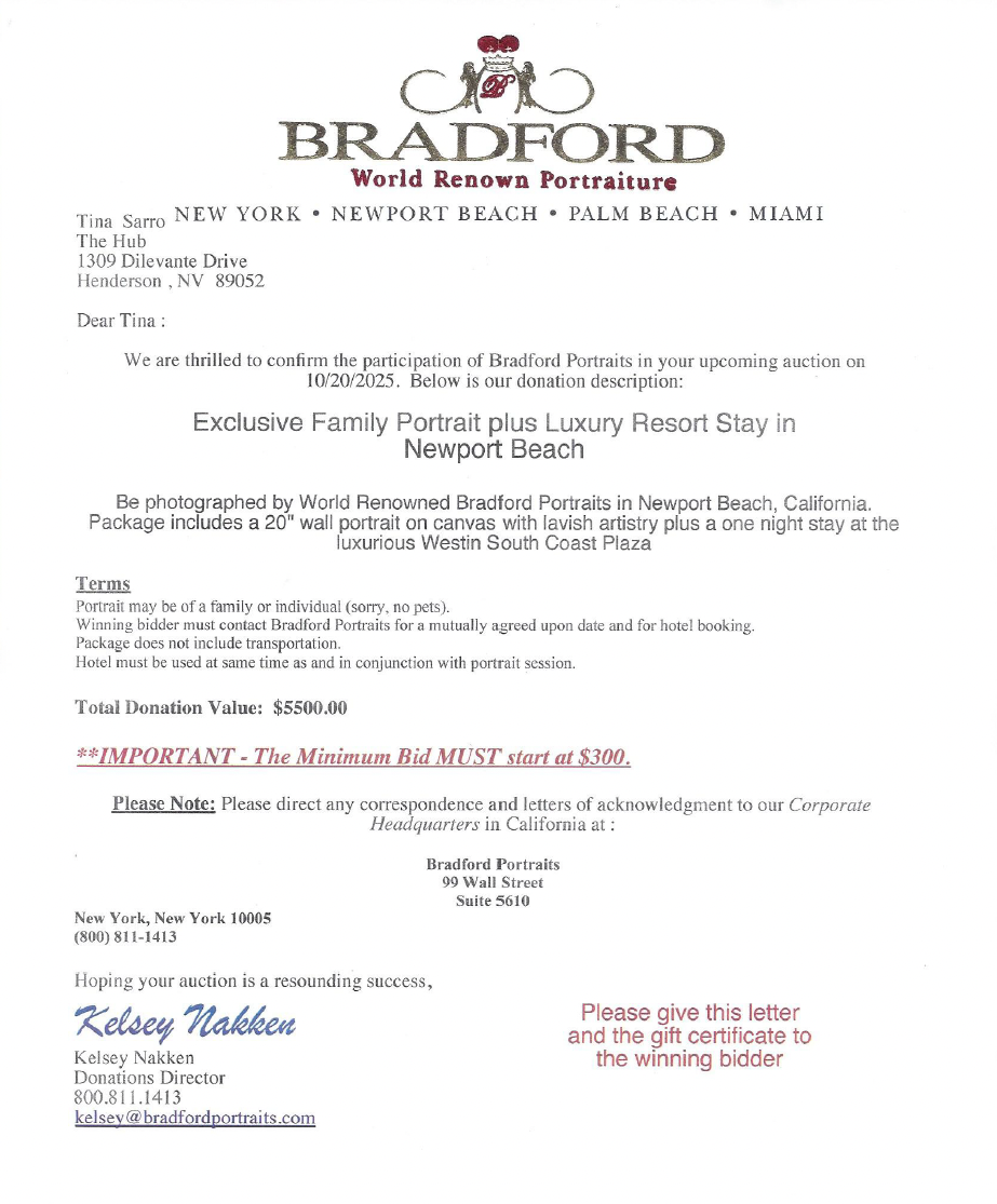 Be photographed by world renowned Bradford portraits in Newport Beach, California. Package includes a 20 inch wall portrait on canvas with lava artistry plus a one night stay at the luxurious Westin South Coast Plaza.